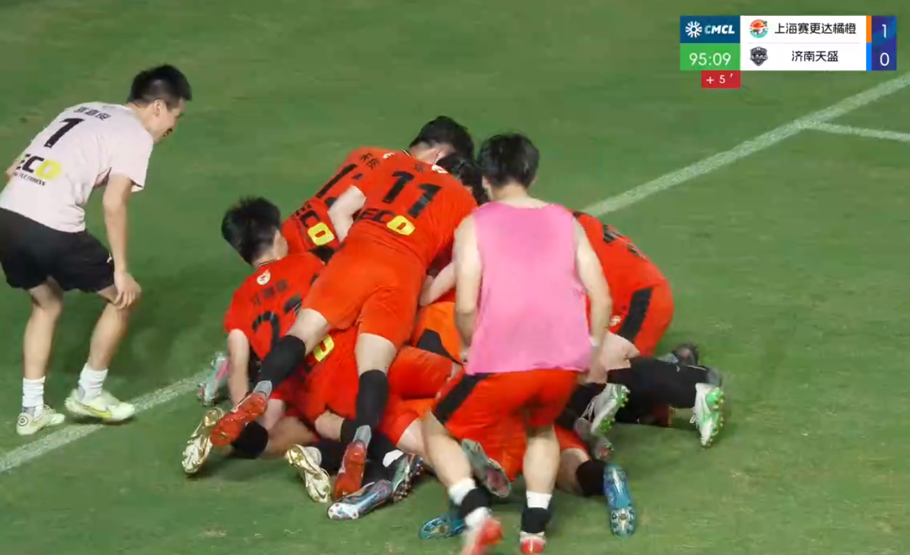 正当大家以为比赛会以平局收场时,补时最后1分钟读秒结束时,场上出现了意外:上海赛更达橘橙在曹申刚被红牌罚下的情况下,获得任意球机会。球开出之后,替补登场的球员肖洋洋抓住机会,补射破门,完成绝杀,帮助球队收获两连胜。